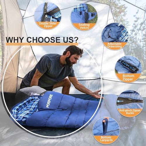 Double-Layer Filling: The POEPORE sleeping bag is lined with flannel cloth, which is gentle and comfy. Each the highest and backside layers are full of 400g/m² (2*200g/m²) hole cotton to stop warmth loss. The double-layer hole cotton filling gives wonderful insulation, preserving you heat and comfy on chilly nights with out worrying about low temperatures.