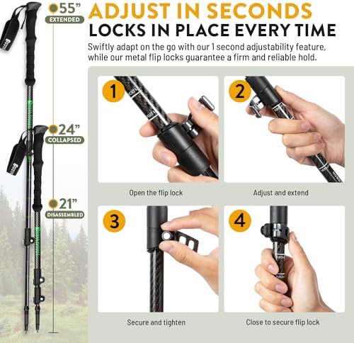 100% Carbon Fiber Trekking Poles by USA Model – Extremely Robust Light-weight Collapsible Climbing Poles with Cork and EVA Foam Grips & Fast Adjustable Flip Locks