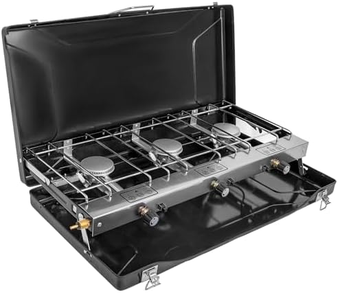 PORTABLE: This 3-burner moveable tenting range comes with a built-in carrying deal with that permits you to carry it conveniently. It has a compact construction and weights solely 10lbs which makes it even simpler to hold it round. It may be taken alongside in a baggage or storage field, and even massive tote bag, so carrying this moveable propane tenting range is a breeze factor to do! Dimension: 23.4”x12.8”x3.4″, Weight:10 LB