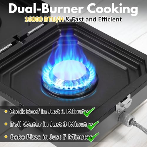 🎇Environment friendly Cooking With Two Burners: Use 2 adjustable tenting burners for a complete of 16,000 BTU energy and the knob ignition, simultaneous boiling, frying and braising, good for household dinners or group tenting journeys. Cooks two dishes directly, ultimate for hearty breakfasts and connoisseur dinners within the nice outdoor.