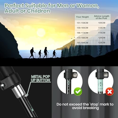 【ADJUSTABLE LENGTH & QUICK LOCK SYSTEM】Rapidly modify the poles from 41.3″ to 49.2″ with the safe quick-lock system, permitting you to customise the size in your peak and mountain climbing type, making certain optimum consolation and posture.