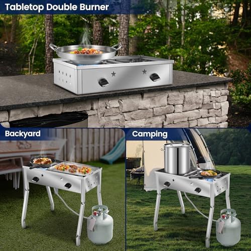 Full Package deal: This double propane burner comes with a 47″ stainless-steel hose and a 20PSI regulator(gasoline tank not included), making certain a secure and dependable flame for all of your outside cooking wants.