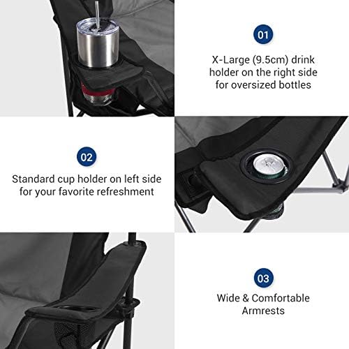UNIQUE DESIGN FEATURES: The twin cup holders on this fold up chair for outdoor are totally different sizes. Normal measurement on the left in your favourite beverage and outsized on the proper for bigger bottles and drinks. Nice folding tenting chair for adults