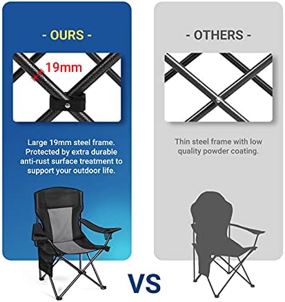 OVERSIZED & STABILE: Giant & sturdy, the metal body of the tenting chair for grownup helps as much as 350lbs. The tall again & large seat are nice to lounge comfortably. Extensive toes give a steady platform. The folding chair outside is 25″W x 21.6″ D x 43″H
