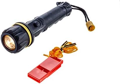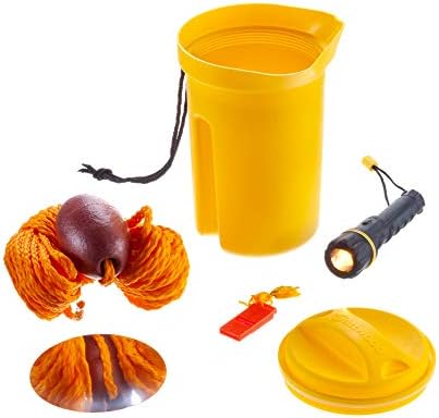Contains emergency Flashlight, pealess security whistle, bailer with easy-grip deal with and 50′ of floating line with float and reflective Mylar sign mirror