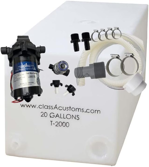 Class A Customs | 20 Gallon RV Concession Recent Water Tank with Plumbing Package & 12 Volt Water Pump | T-2000-BPK-PUMP