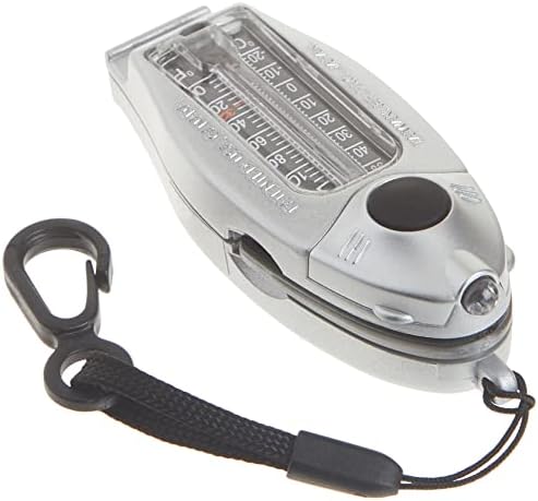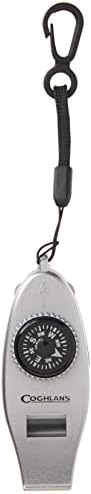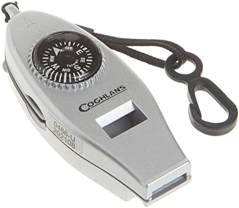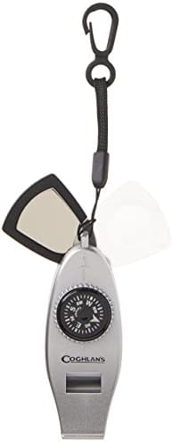Shrill-sounding security whistle with LED gentle, magnifier, compass, two-scale thermometer, and sign mirror