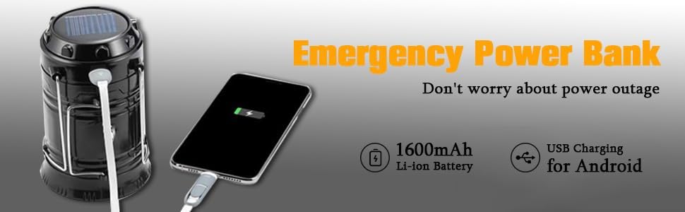 【Two Charging Strategies】Constructed-in 1600mAh Li-ion rechargeable battery, the improve led lantern with two charging strategies: Photo voltaic charging and USB Charging. Automated power-off safety, Don’t fret about overcharging. The lantern with USB output port can be utilized as an influence financial institution for Android in emergency.