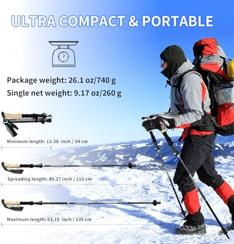 ULTRA COMPACT & PORTABLE: This trekking poles’ retractable tri-fold design allow them to collapse right down to a transportable 13 inches (33 cm) simply and rapidly. Becoming right into a backpack, baggage circumstances, or duffel luggage for compact journey! When in use, you possibly can lengthen your poles from 45.3″ all the way in which to 53.2″ rapidly.