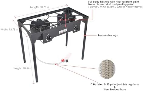 POWERFUL: Whole output 110,000 BTU. Produced by two 55,000 BTU forged iron burners. Consists of CSA Listed 0-20 PSI adjustable regulator and steel-braided hose