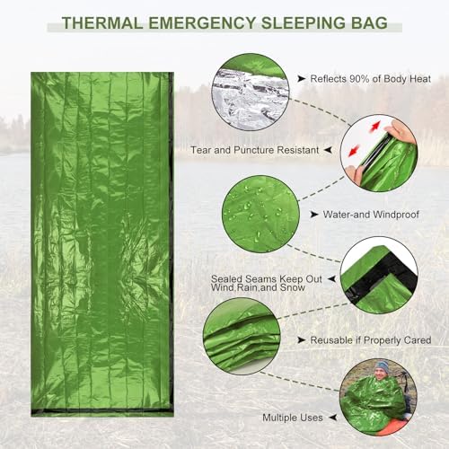 EMERGENCY SLEEPING BAG: This emergency sleeping bag is made from extra-thick 28UM PE materials with a tear and puncture resistant coating, It’s reusable, water and windproof. The particular materials displays 90% of your physique’s warmth again to you, keep heat and alive in excessive situations. Save your life in an emergency.