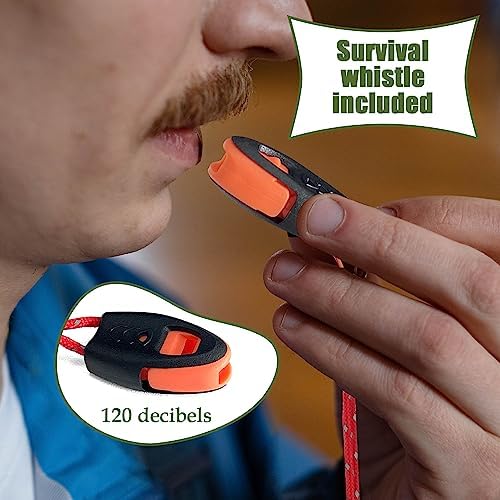 Additional survival whistle enhances your security within the outdoor. Carabiner makes it simple to hold in your belt or backpack.