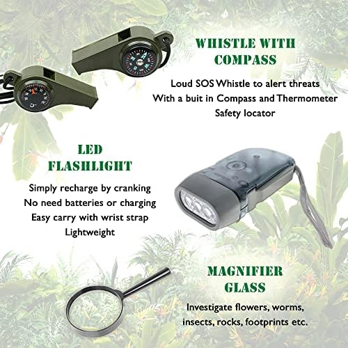 2x Walkie Talkies with lanyards (4*AAA batteries for every not included)Binoculars (carrying case, cleansing fabric, neck strap)Hand-crank FlashlightMagnifier GlassMilitary Lensatic CompassSOS Whistle with lanyardAdjustable Baseball CapDrawstring Backpack