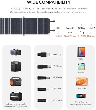 Huge Compatibility & 100% Secure Charging: LUMOPAL 60W photo voltaic panel equipment is go well with for cell phones (Android and Apple), tablets, cameras, laptops, transportable energy stations, and different small digital gadgets. And with a built-in good chip, LUMOPAL photo voltaic panel can establish the machine intelligently and gives optimum charging velocity, and in addition present overcurrent, overheat, and brief circuit safety, making certain 100% protected Charging!