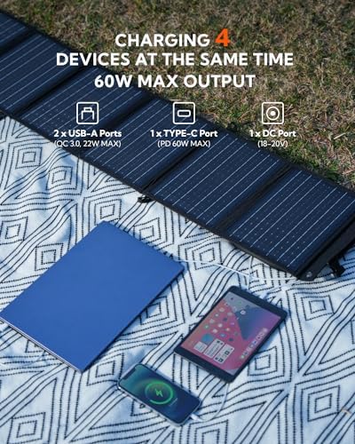 Foldable Photo voltaic Panel, LUMOPAL 60W Transportable Folding Photo voltaic Charger Equipment with USB-C PD60W 5V USB-A QC3.0 DC18-20V Ports,IP65 Waterproof for RVCamping Backpacking Suitable with Telephone Pill Energy Station