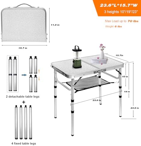 Made from premium aluminum alloy body and MDF tabletop, waterproof and never simple to rust The sturdy folding tenting desk ft use thick, 1-in aluminum alloy tubes which might maintain as much as 70lbs The moveable tenting desk is supported by an extremely secure triangle construction that locks securely in place whenever you push the latch When the small folding desk is unbalanced, the peak of the ft could be adjusted barely to adapt to totally different outside terrains With its mesh storage layer and S-shaped hooks, the mini folding desk retains you organized