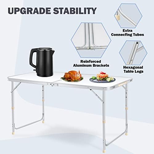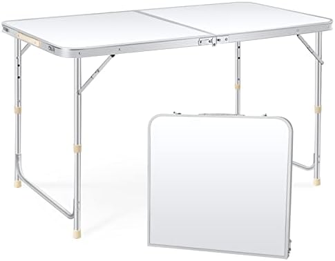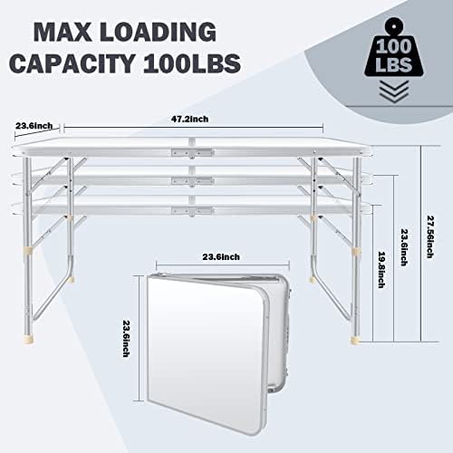 [Compact Folding Table with Adjustable Heights]: 3 Adjustable heights for all events. Our 4ft folding desk will be adjusted to a snug peak of (21.6” or 24.4” or 27.5”). The massive floor space is 48”L x 24”W and might assist as much as 100 LBS, offering loads of utilization house.