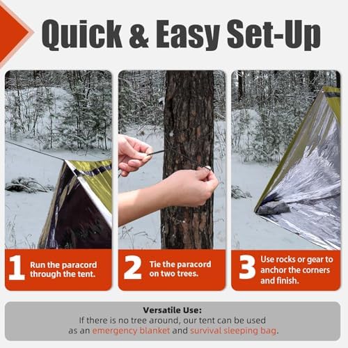 Fast & Simple Set-Up and Versatile Use: 1. Run the 20ft paracord by the tent and tie it up between two bushes. 2. Use rocks or gear to anchor the corners. 3. Climb in and keep protected. Our shelter can accommodate two adults and can be used as an emergency blanket and survival sleeping bag if no tree round