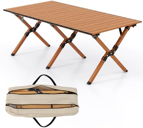 Constructed with a sturdy aluminum body, this roll up desk supplies dependable assist and stability. The wooden grain portray floor provides a contact of magnificence and pure aesthetics to your outside setting. Whether or not you are having fun with a meal, enjoying video games, or just stress-free, this desk provides a cushty and spacious floor for as much as 6 individuals. One of many standout options of this tenting desk is its roll-up tabletop design. This modern function permits for simple set-up and storage. The snap-on connection ensures a safe and secure tabletop, providing you with peace of thoughts throughout use. When you’re completed, merely roll up the tabletop and pack it into the included carrying bag for hassle-free transportation.