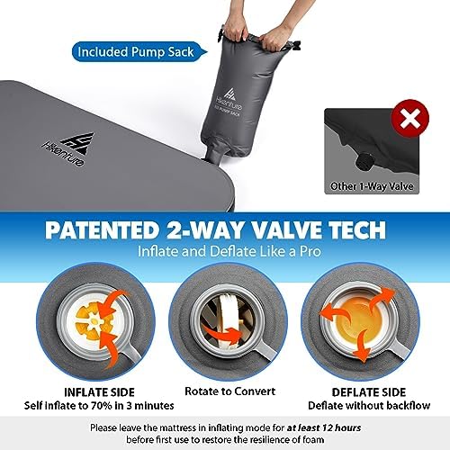 𝐒𝐀𝐕𝐄 𝐘𝐎𝐔𝐑 𝐓𝐈𝐌𝐄 𝐀𝐍𝐃 𝐁𝐑𝐄𝐀𝐓𝐇 𝐓𝐎 𝐈𝐍𝐅𝐋𝐀𝐓𝐄 – Our self-inflating truck mattress mattress comes with a patented 2-way valve and makes inflating & deflating a breeze. Simply a number of minutes for it to self inflate and some baggage of air added with the included pump sack, a comfortable tenting mattress’s accomplished. Flip the valve to deflating facet and the valve will cease air from getting again to make sure a neater deflation.