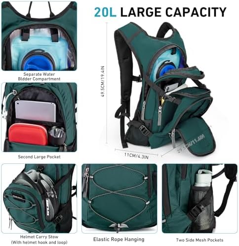 20L LARGE STORAGE: The trekking backpack is provided with 4 compartments. A separate insulated compartment with a hydration bladder, further massive opening for simple loading of the water bladder system. A big entrance compartment for touring baggage, the second entrance compartment for small objects, the light-weight hydration backpack additionally comes with a helmet buckle and two mesh pockets on either side of the backpack, mountaineering poles, bike helmet, bike mild, sleeping mats or jackets could be connected.