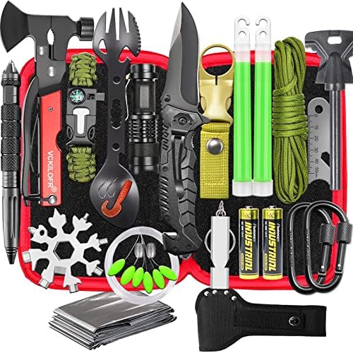 Vital Gear You Should have: Incorporates 14 in 1 Hatchet, Tactical Pen, 18 in 1 Snowflake Instrument, Water Bottle Clip, Emergency Blanket, Flint Stone Scraper, Flashlight, 2 pcs Glow Sticks, Multi-use Spoon Fork, Whistle, Parachute Twine, Survival Bracelet, Fishing equipment, 2pcs AA Battery, and Storage Case.