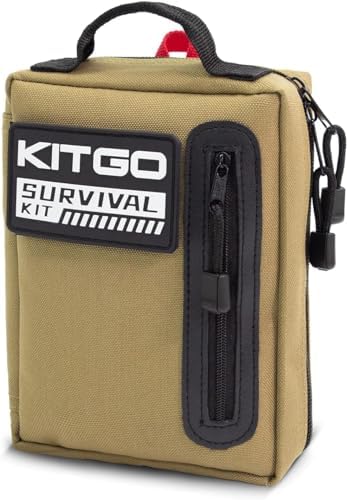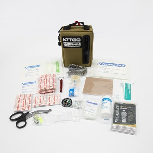 Kitgo Tenting Survival Package First Support 101 Piece Skilled Emergency Survival Gear Instrument for Searching Mountain climbing Out of doors Journey Fishing Journey Army Tropical Storms (Khaki)