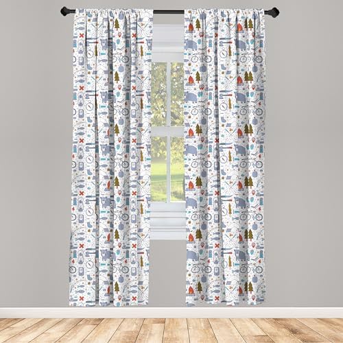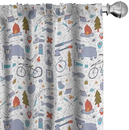 Lunarable Tenting Window Curtains, Cartoon Bear Tent and Compass Outside Interest Theme Climbing Doodle, Light-weight Decor 2-Panel Set with Rod Pocket, Pair of – 28″ x 84″, Vermilion Bluegrey