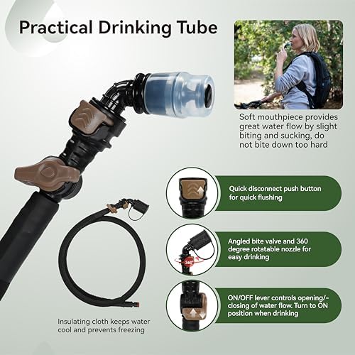 360 Rotatable Gentle Chew Valve: You don’t have to bend over or bend the tube an excessive amount of, can drink simply within the regular place. On-Off valve controls the opening and shutting of water move, no water drips when valve is closed. Tube head might be dismantled for straightforward tube cleansing. Gentle silicone mouthpiece makes the water move quick, you may suck water just by biting. Mud cap protects mouthpiece from mud and dust.
