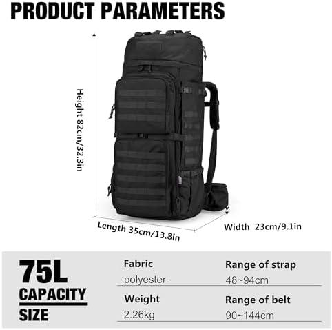 【DURABLE & MULTIFUNCTIONAL】- This 75L molle backpack with chest straps to deal with the burden in order that it is nicely used as a 3 day assault pack,bug out bag,survival backpack,military backpack,trekking backpack or day pack. Fits for mountain climbing,looking,trekking,tenting,climbing,touring.