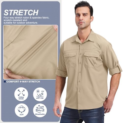 Mens Safari Shirt UPF 50+ UV Safety Lengthy Sleeve Fishing Cargo Shirt, Breathable and Quick Dry