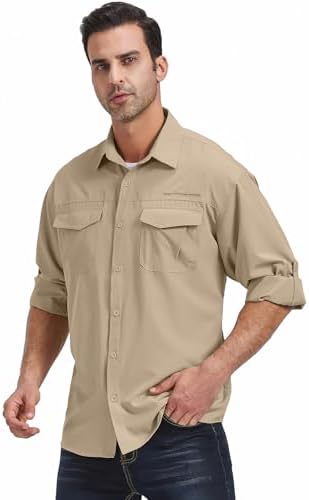Designed particularly for anglers, this light-weight, relaxed match, nylon shirt dries quick, retains you cool, and protects in opposition to UV rays, for those who like outside actions, that is the finest for you!Rolled-up sleeves safe with loops and button tabs, and convert to a brief sleeve for decent days.