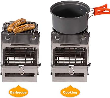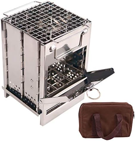 Moveable Folding Tenting Wooden Range for Outside Cooking, Light-weight Stainless Metal Wooden Burning Camp Range with Grill for Backpacking BBQ Picnic, Small