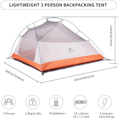 Light-weight Backpacking Tent: Fabricated from light-weight & wear-resistant 20D nylon materials, complete weight about 2.8kg/6.2lbs; Small package deal measurement: 20×7.1×7.1inch(51x18x18cm), matches your backpack with loads of room for different tenting gears, the Cloud up 3 Particular person Tent is ideal for two Particular person or 3 Particular person backpacking, tenting, climbing, biking, and so forth.