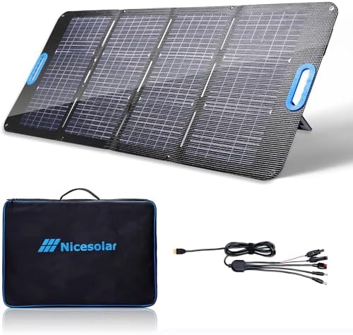 Nicesolar 100 Watt Transportable Photo voltaic Panel. DC 21V, designed for many moveable energy station out there. With USB-A&C QC3.0&PD 65W fasting charging, it may be used to cost cellphone, powerbank, pill, laptop computer. Pefect for outside tenting, barbecue, backyard, balcony and fishing, or emergency.