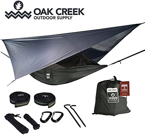 EVERYTHING INLCUDED: Contains single hammock with bug web, 2 tree straps, 2 aluminum carabiners, and a couple of guylines. Moreover, we embrace 4 aluminum stakes and a water-proof rainfly.