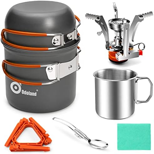 Odoland 8pcs Tenting Cookware Mess Package, Tenting Pot and Pan Set with Mini Backpacking Range, Stainless Metal Cup, Spork and Tank Bracket, Cooking Gear for Out of doors, Climbing, Picnic, Campfire
