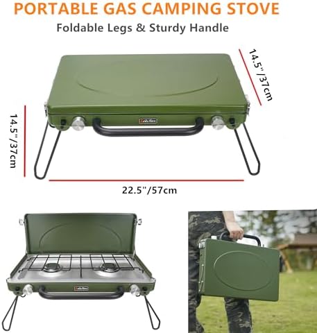 【FOLDABLE & PORTABLE CAMPING STOVE】 Expertise wonderful portability with this folding propane tenting range. The range lid and the legs are foldable for simple transports. Outfitted with two burners and a sturdy deal with, it is your very best companion for tenting, climbing, RV journeys, and extra. The heavy-duty latch ensures safe closure throughout storage.