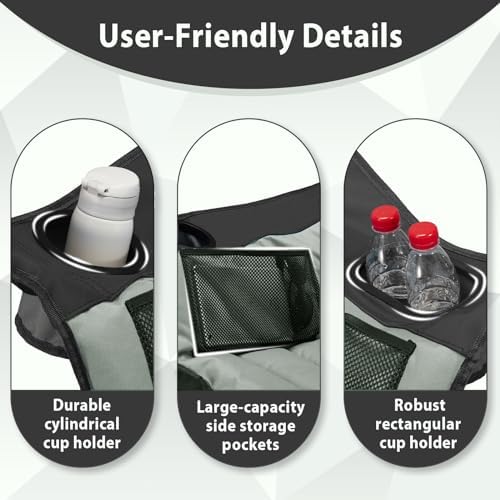 Consumer-Pleasant Particulars: For added comfort, we ingeniously designed 2 cup holders and a pair of aspect pockets on this folding chair, permitting you to position drinks, smartphones, notebooks, and different objects in an organized method. This considerate design goals to offer you the most effective seating expertise whereas releasing up your arms