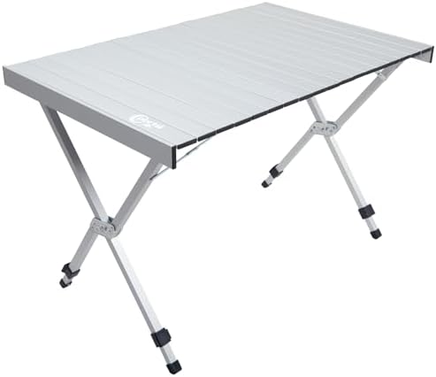 PORTAL Folding Out of doors Tenting Desk with Adjustable Peak, Aluminum Roll-Up High and Carry Bag, Large Massive Transportable Tables for Picnic, BBQ and Tailgating, Silver
