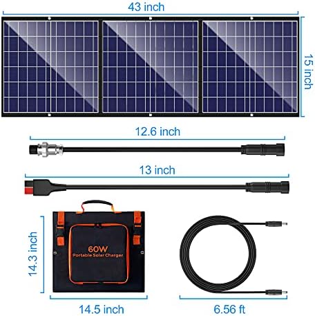 Package deal Contents 1* 60W foldable photo voltaic panel with bracket 1* DC to DC cable(5.5*2.1 mm) 1* Anderson cable 1* Aviation cable 1* 11 in 1 connector 1* Handbook