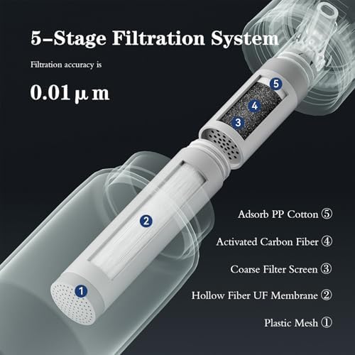【Meals Grade Materials】: 5 Stage superior high-performance filter included:Medical Grade Hole Fiber UF Membrane, Coconut Shell Activated Carbon, Beads and Medical Grade PP Cotton. Made by sturdy food-grade plastics: BPA Free Tritan. Be secure for human consumption. Filtration accuracy is 0.01 microns which might offer you a dependable supply of pure ingesting water at any time and wherever.