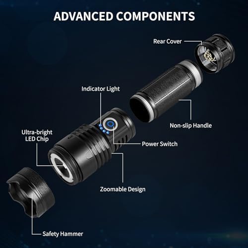 【990000 Lumens Flashlight】The tremendous vibrant led flashlight adopts the newly upgraded P70.2 LED chip, which may emit a brilliant vibrant beam, sufficient to light up the vary of a soccer subject, and the illumination distance is as much as 3280 ft. 5 Gentle Modes: Sturdy/Medium/Weak/Strobe/SOS. You should utilize it for various lighting necessities.