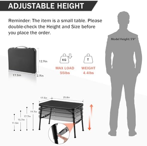 [ADJUSTABLE HEIGHTS]: 4 Adjustable heights for all events. Folding card desk is designed with 4 telescoping ABS plastic legs, that may be adjusted to numerous heights 11.5″, 15.7″, 17.7″, and 19.7″, The big floor for the desk is 25.8”L x 17.5”W, offering loads of utilization area.