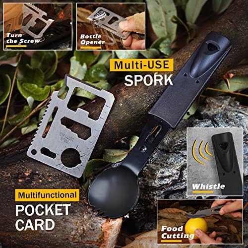 14 in 1 Survival Equipment: With Multi-use spoon fork, emergency blanket, hearth starter, flashlight, wire noticed, water bottle clip, compass, pocket card, waterproof survival case, bracelet, fishing gear, this package gives the important instruments for survival