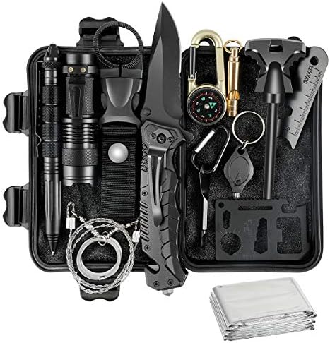 Emergency Survival Equipment – 14 in 1 Survival Gear Together with: improve survival knife, flintstone, improve compass, tactical pen, emergency blanket, flashlight, water bottle clip, wire noticed, whistle,straight screwdrive,waterproof field and Black present bag.
