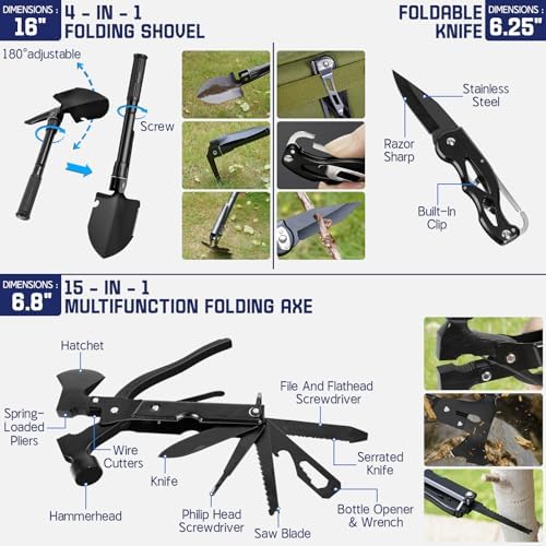 【Survival Gear & Tenting Necessities】This can be a skilled emergency package, it incorporates varied sensible survival instruments: 15 in 1 hatchet, folding shovel and choose, compass, tactical flashlight, survival bracelet, tactical pen, multifunctional card, 8 in 1 spoon and fork, fireplace stone & scraper, glow stick. These instruments will aid you navigate, begin a fireplace, sign for assist, and meet your primary survival wants.