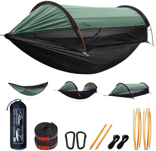 ✅【Straightforward Setup & Full Package】Our hammock tent comes with the whole lot you want for a fast and straightforward setup: 2 foldable aluminum assist poles, 2 carabiners, 2 adjustable hammock tree straps, and a storage bag. Not like conventional hammocks with complicated ropes, our setup is hassle-free, saving you money and time.