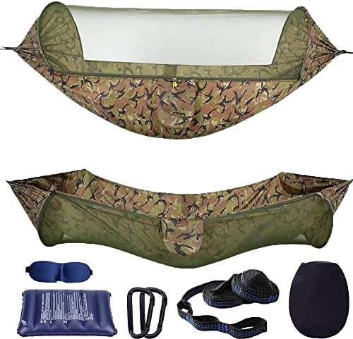 【All of the set up instruments included】Tenting Hammock with Mosquito Internet,Numerous equipment, straightforward to put in.Automated quick-open design, with upgraded metallic metal carabiner, 98 inch 5 + 1 rings tree straps and different equipment, superior straightforward to put in and luxuriate in it, no have to knot, full the set up in seconds.Additional bonus sleep masks and Inflatable pillow will assist loads, it is going to enhance your sleep and calm down your eyes and your spirit. Save your TIME and MONEY. Good items for him/her.