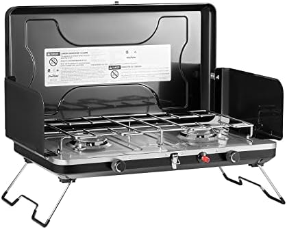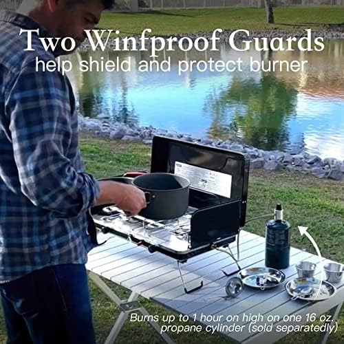 FOLDING CAMPING STOVE: The sturdy folding help legs present a cushty cooking peak and make it straightforward to make use of on any floor. A 3-sided windshield with safety clips helps shield the burners from wind, and a stainless-steel drip tray makes for straightforward cleanup.